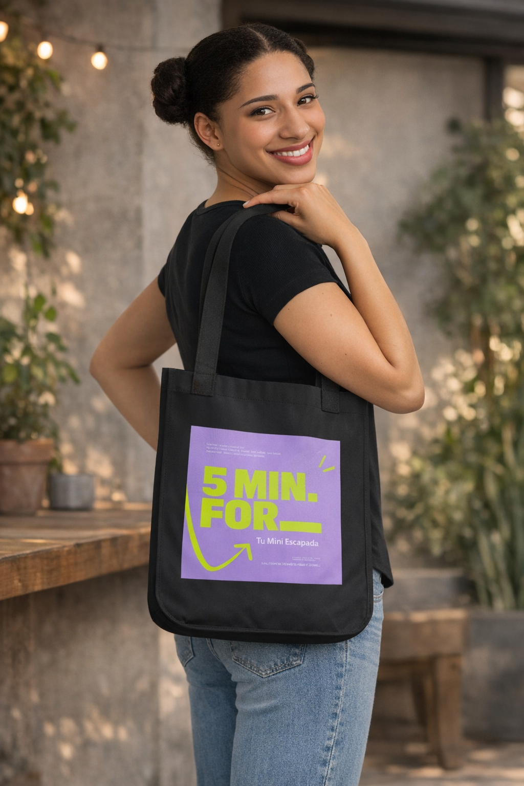 This sleek black tote is part of the official Five Minutes For… podcast merch collection — a daily reminder to pause, breathe, and reconnect.
